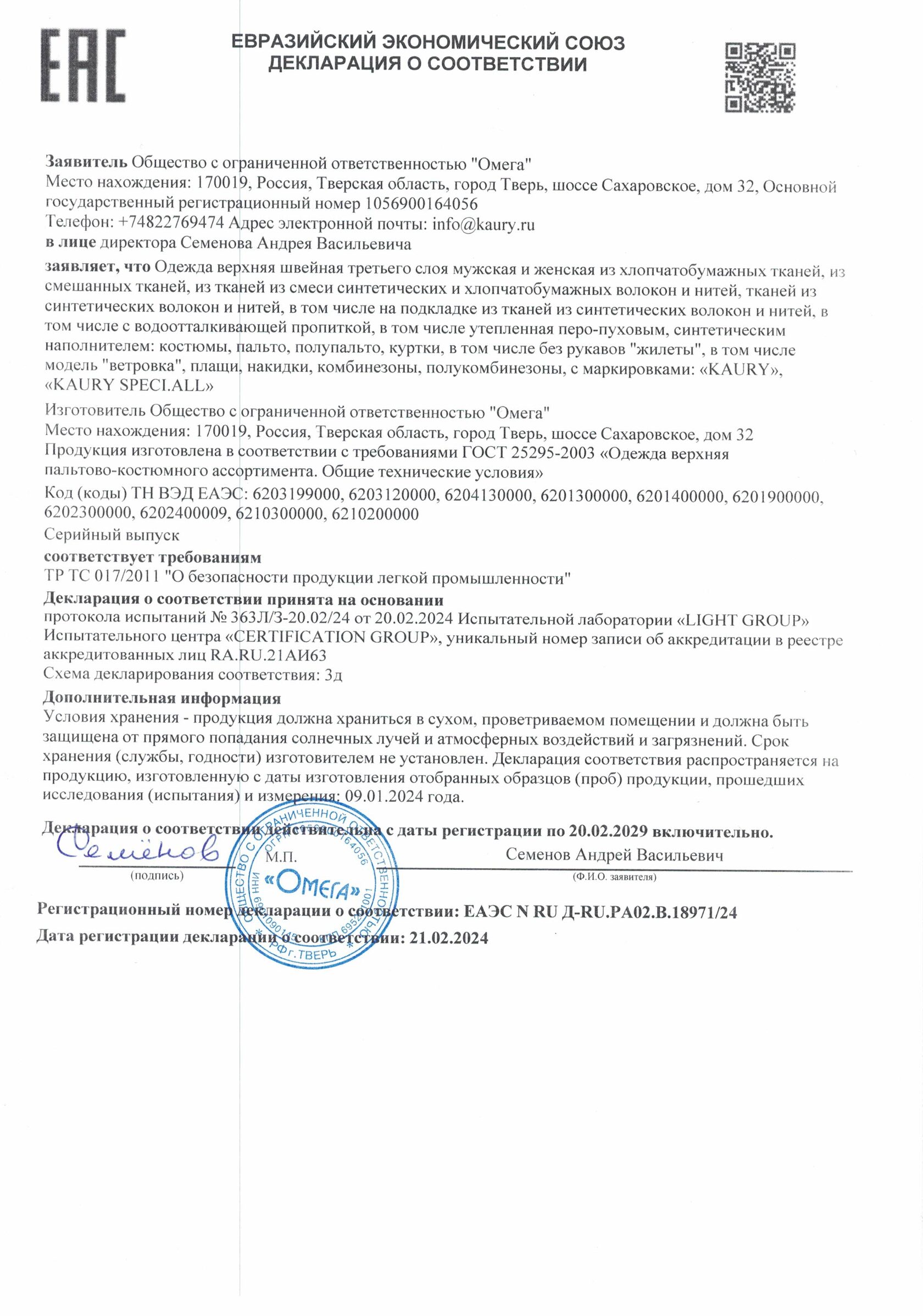 Одежда верхняя швейная третьего слоя мужская и женская (по 20.02.2029)