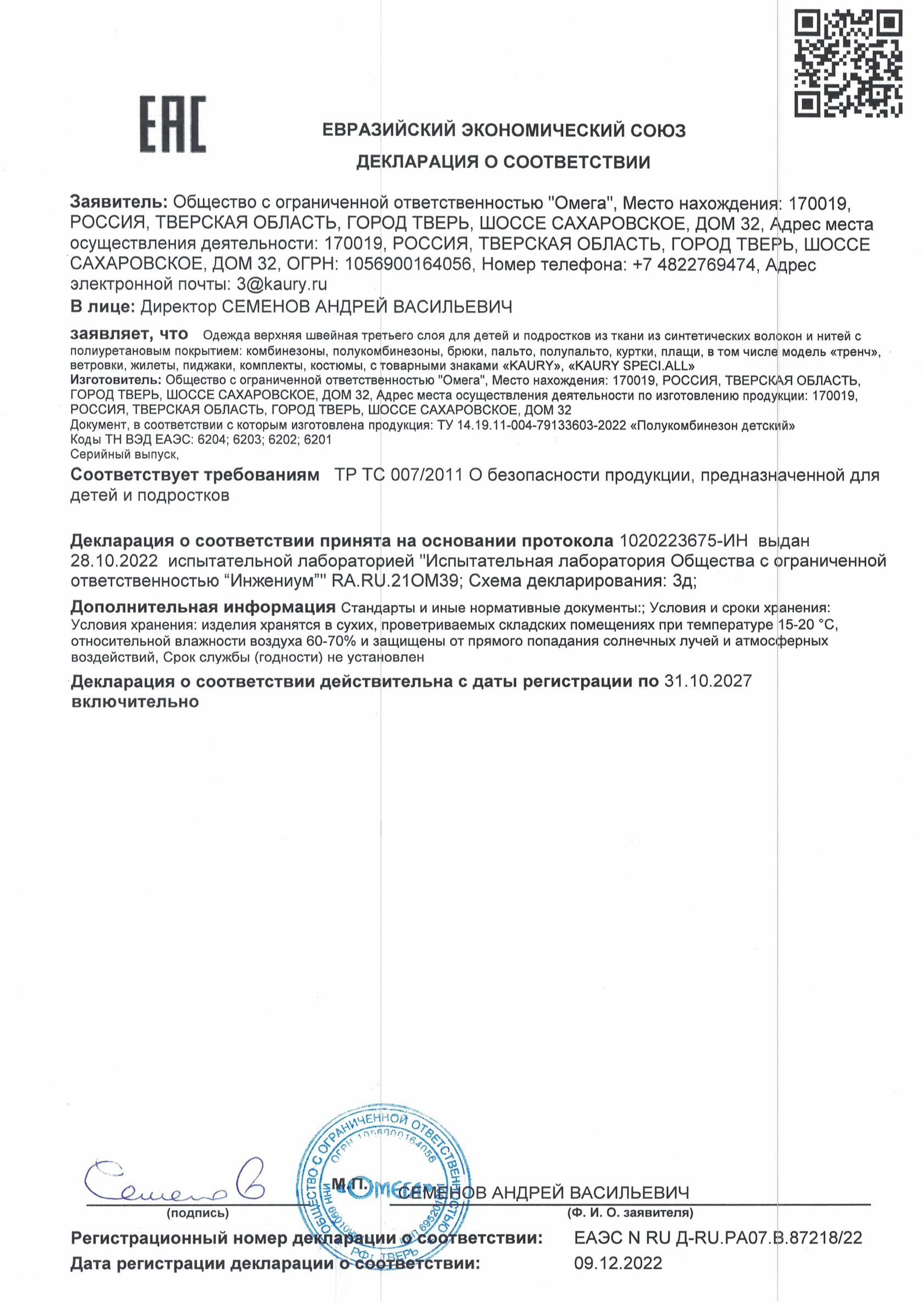 Изделия верхняя швейная третьего слоя для детей и подростков из ткани из синтетических волокон (по 31.10.2027)
