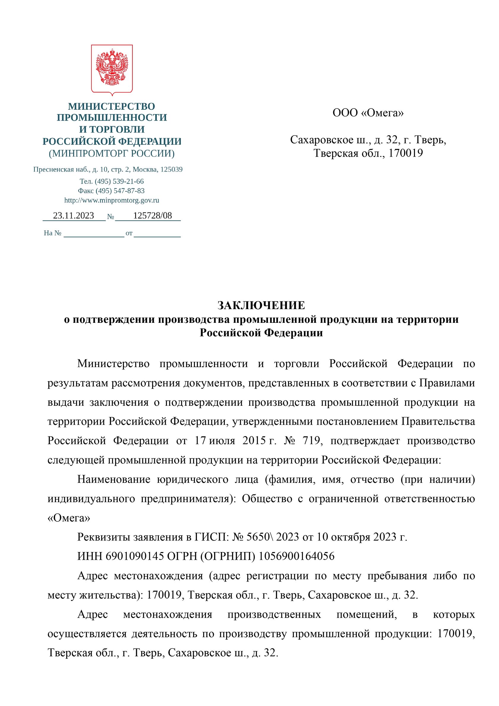 о подтверждении производства промышленной продукции на Территории Российской Федерации