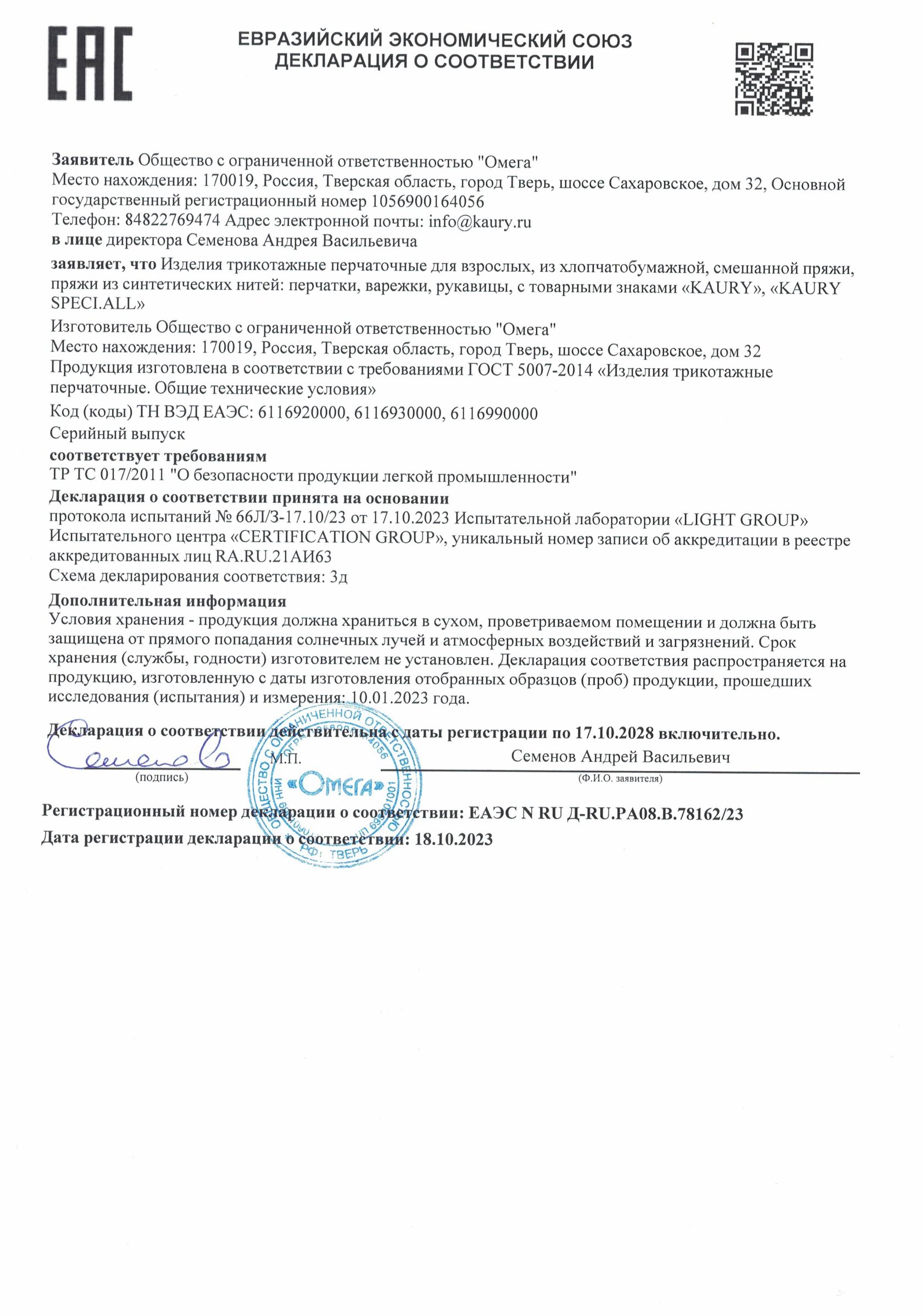 Изделия трикотажные перчаточные для взрослых (по 17.10.2028)